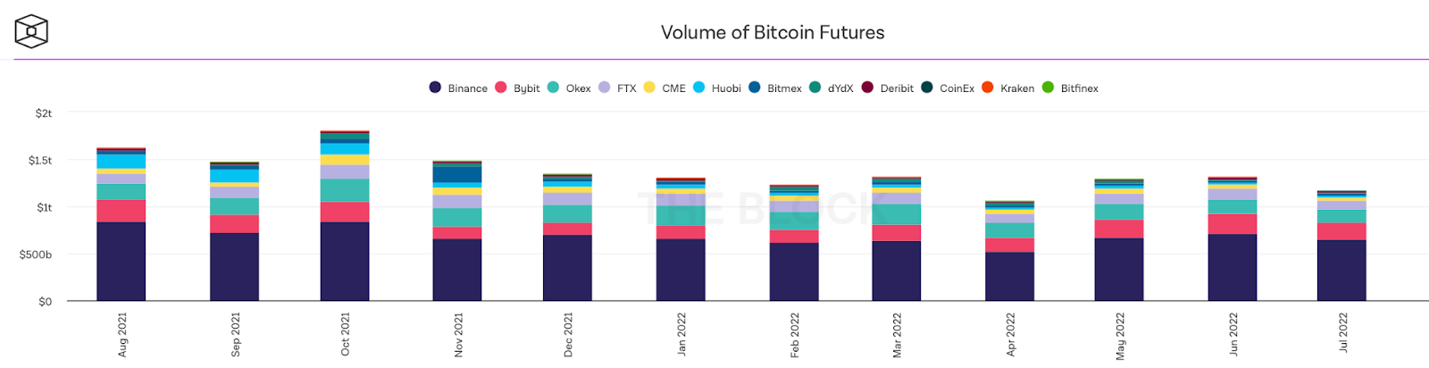 Объем торгов фьючерсами на биткоин не сильно изменился по сравнению с маем и июнем. В пятерку бирж по объему торгов входят Binance, Bybit, Okex, FTX и CME.